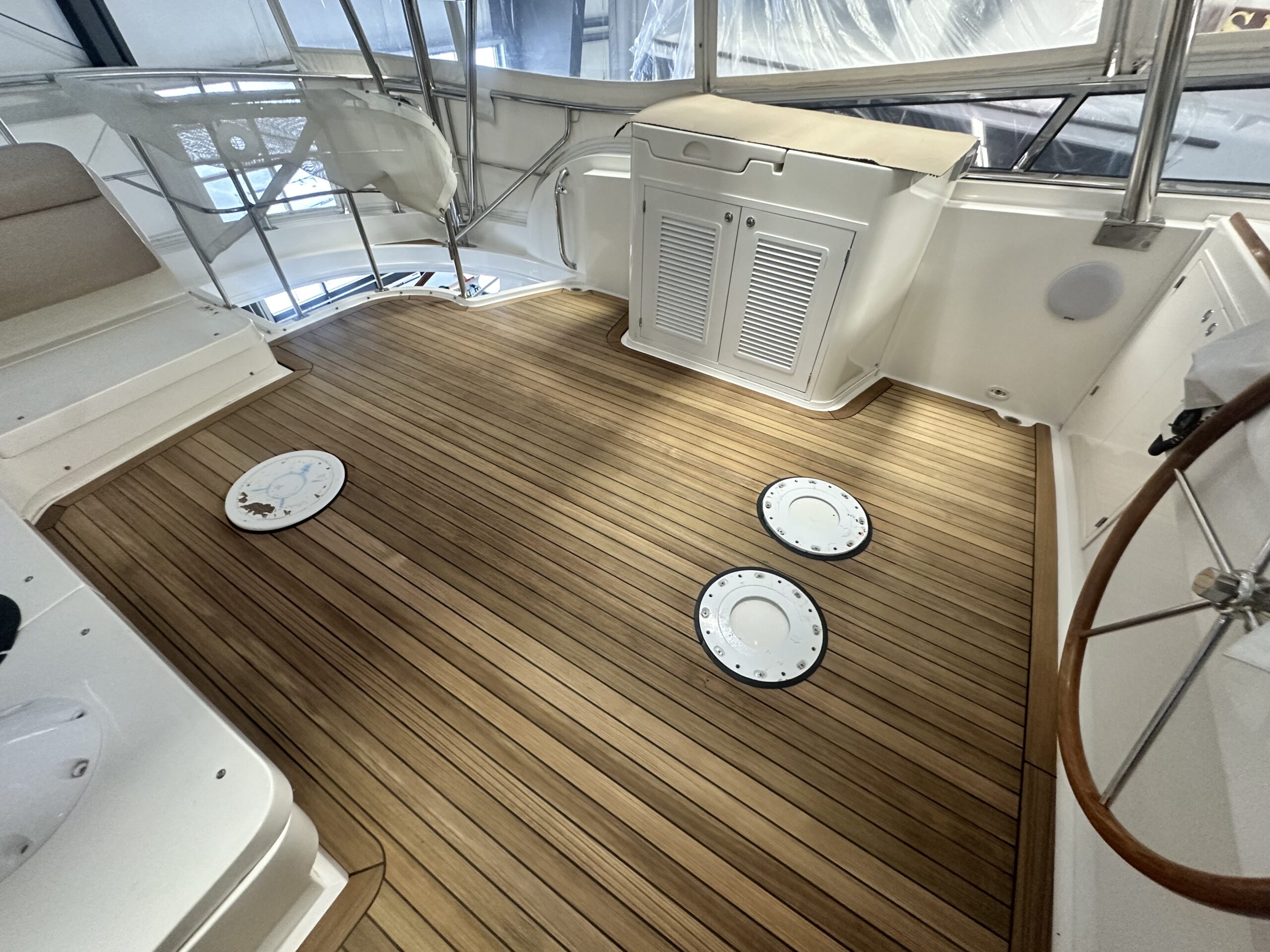 The Walstrom Marine Service Department in Cheboygan completed a major teak refit on the 2004 Grand Banks 58’. The project involved the full removal of the original teak decking and installation of a completely new fabricated teak deck system. Working in coordination with Teak Decking Systems for the initial layout and templating, Walstrom Marine took over the full installation process and completed all finishing and detail work in-house. This project demonstrates our team’s ability to execute complex, high-end teak replacement projects with precision craftsmanship and premium results.