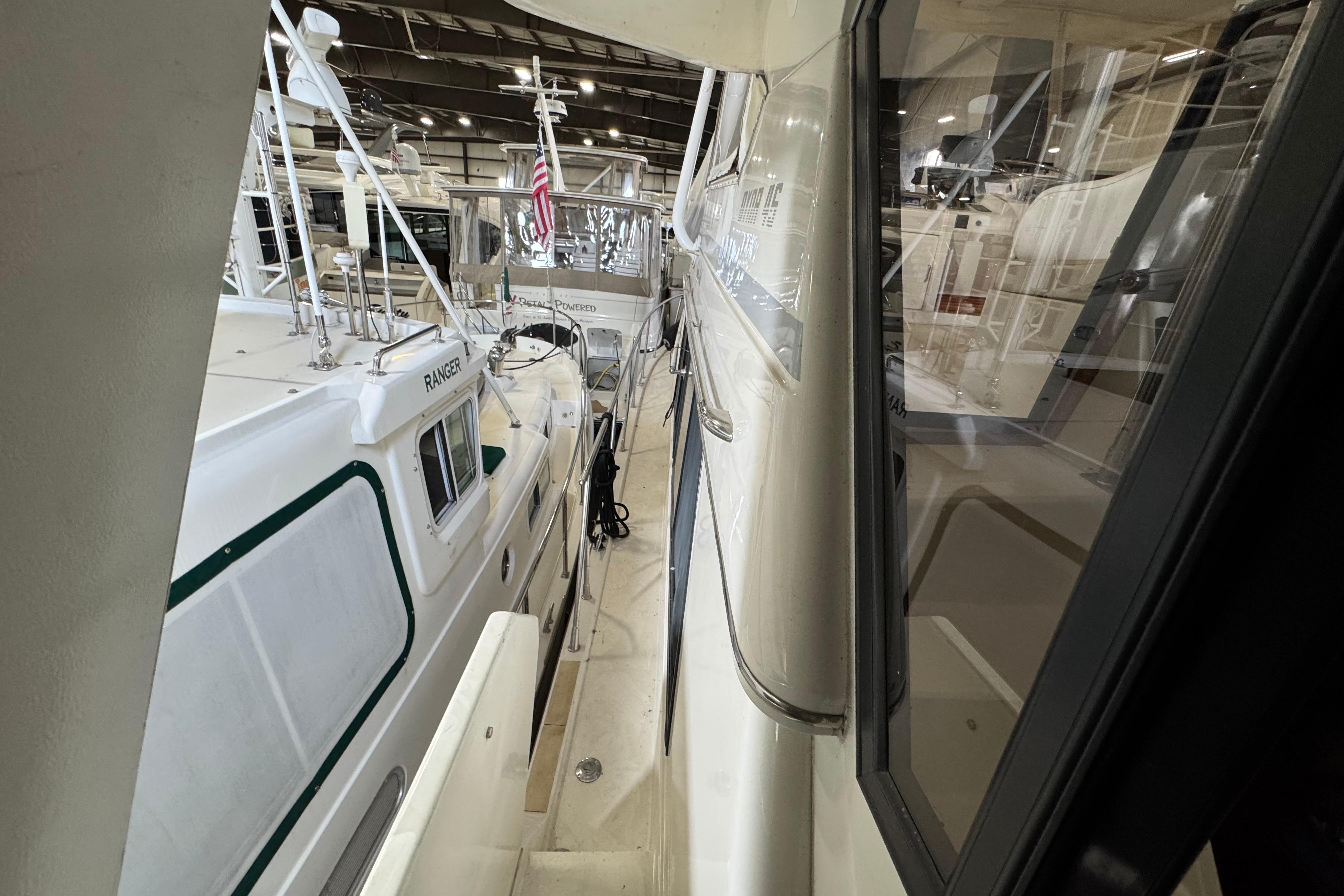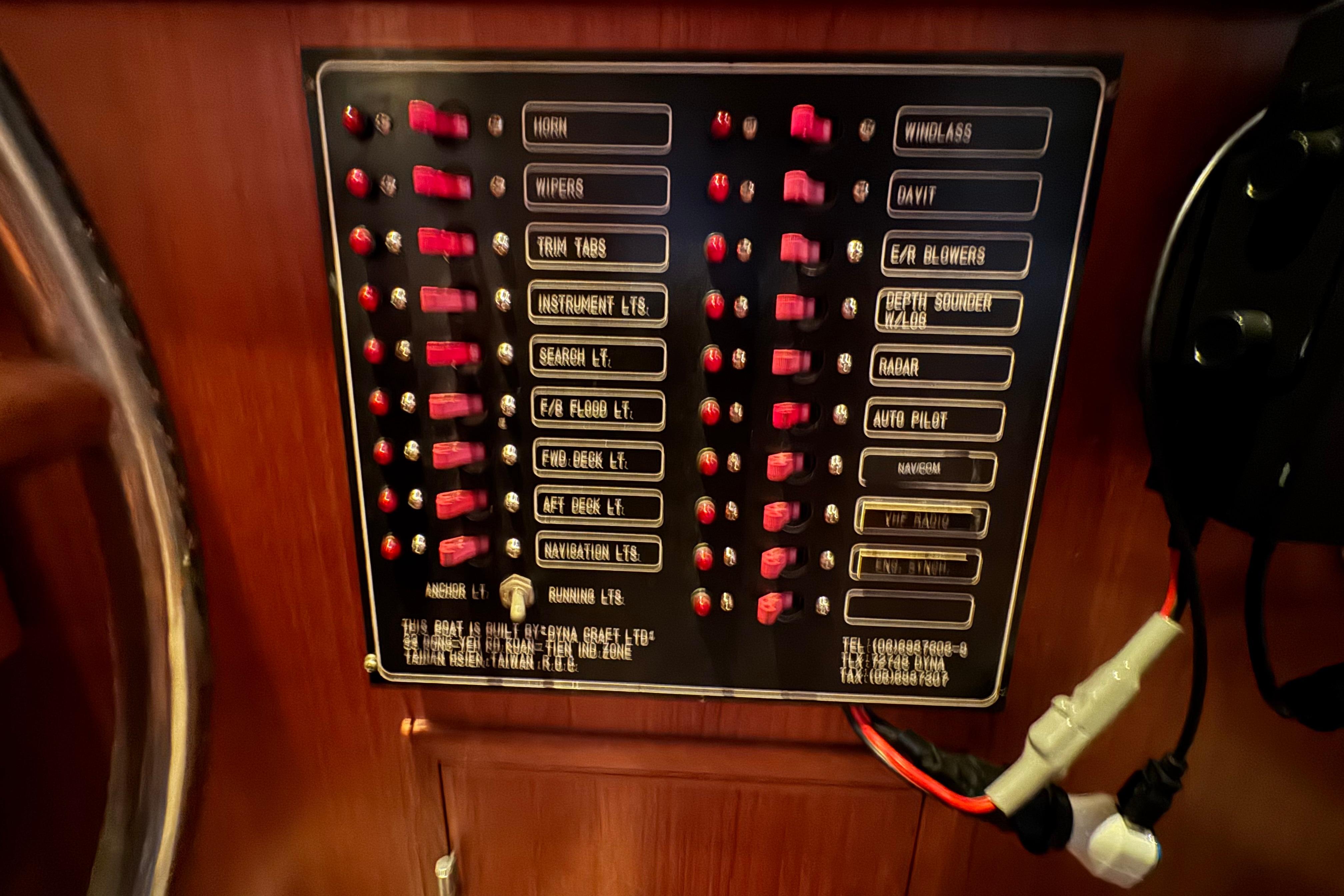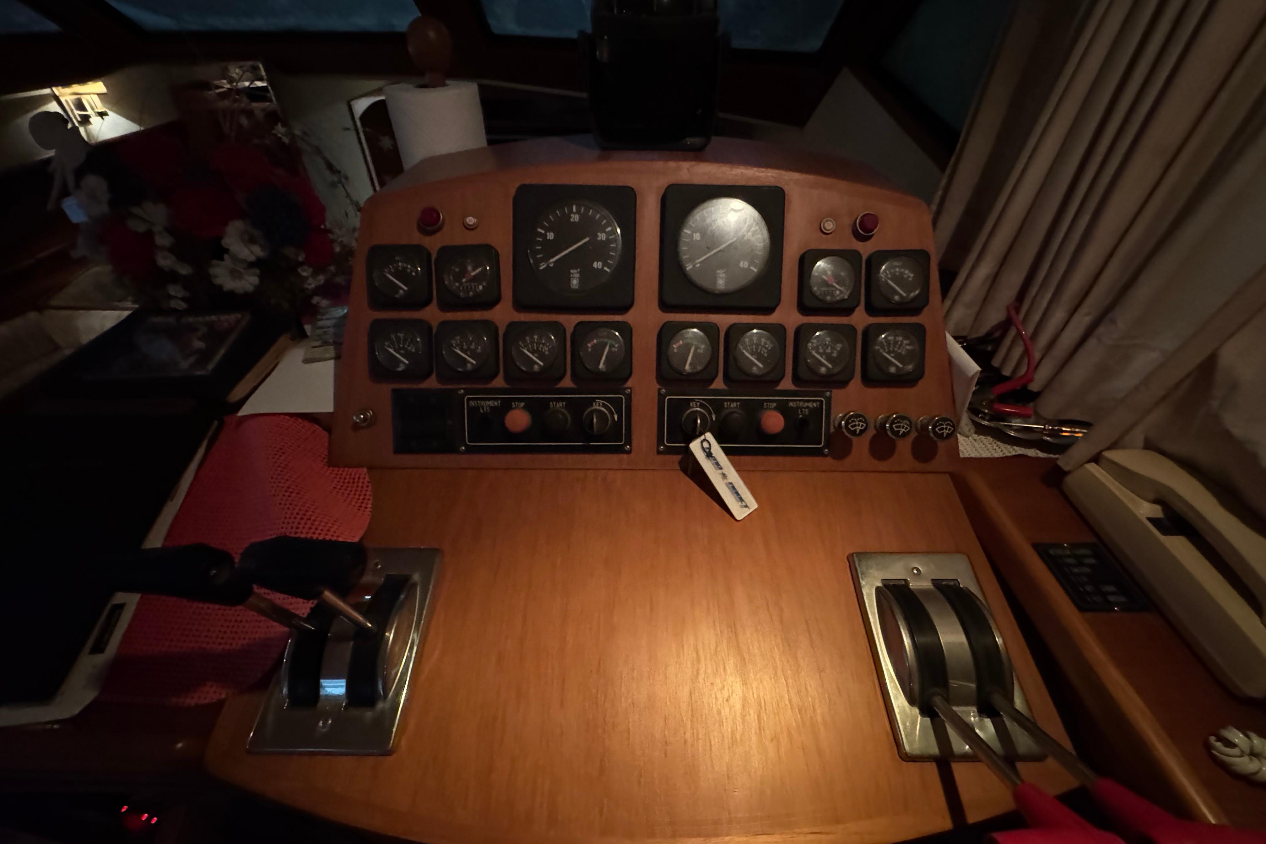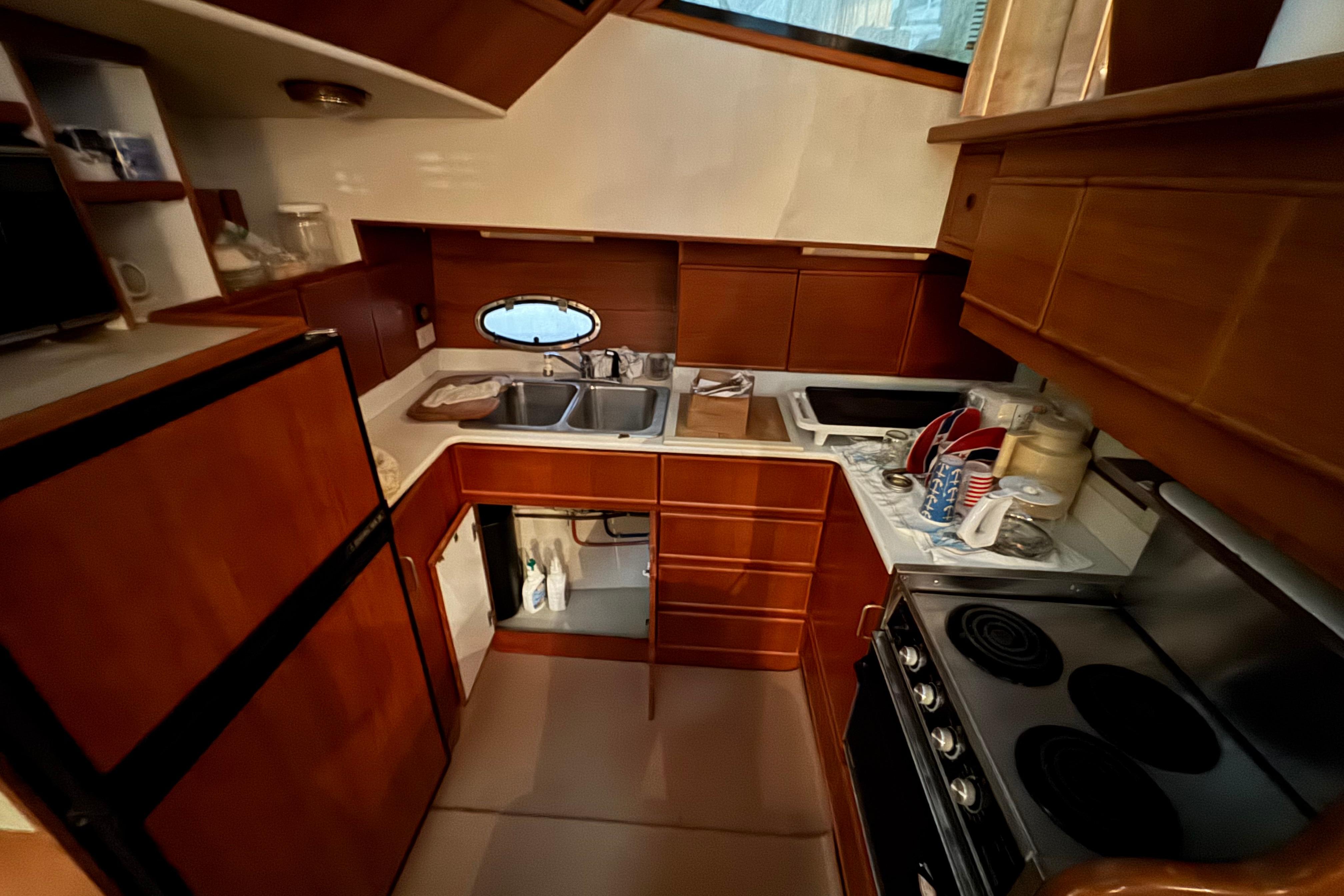 Her well-equipped galley includes a Princess 3-burner stove with oven, Norcold AC/DC refrigeration, microwave, dishwasher, and double stainless steel sink, along with a convenient washer/dryer combo. The aft deck features a wet bar with ice maker and additional refrigeration, while the flybridge provides ample seating and excellent visibility for enjoyable cruising.