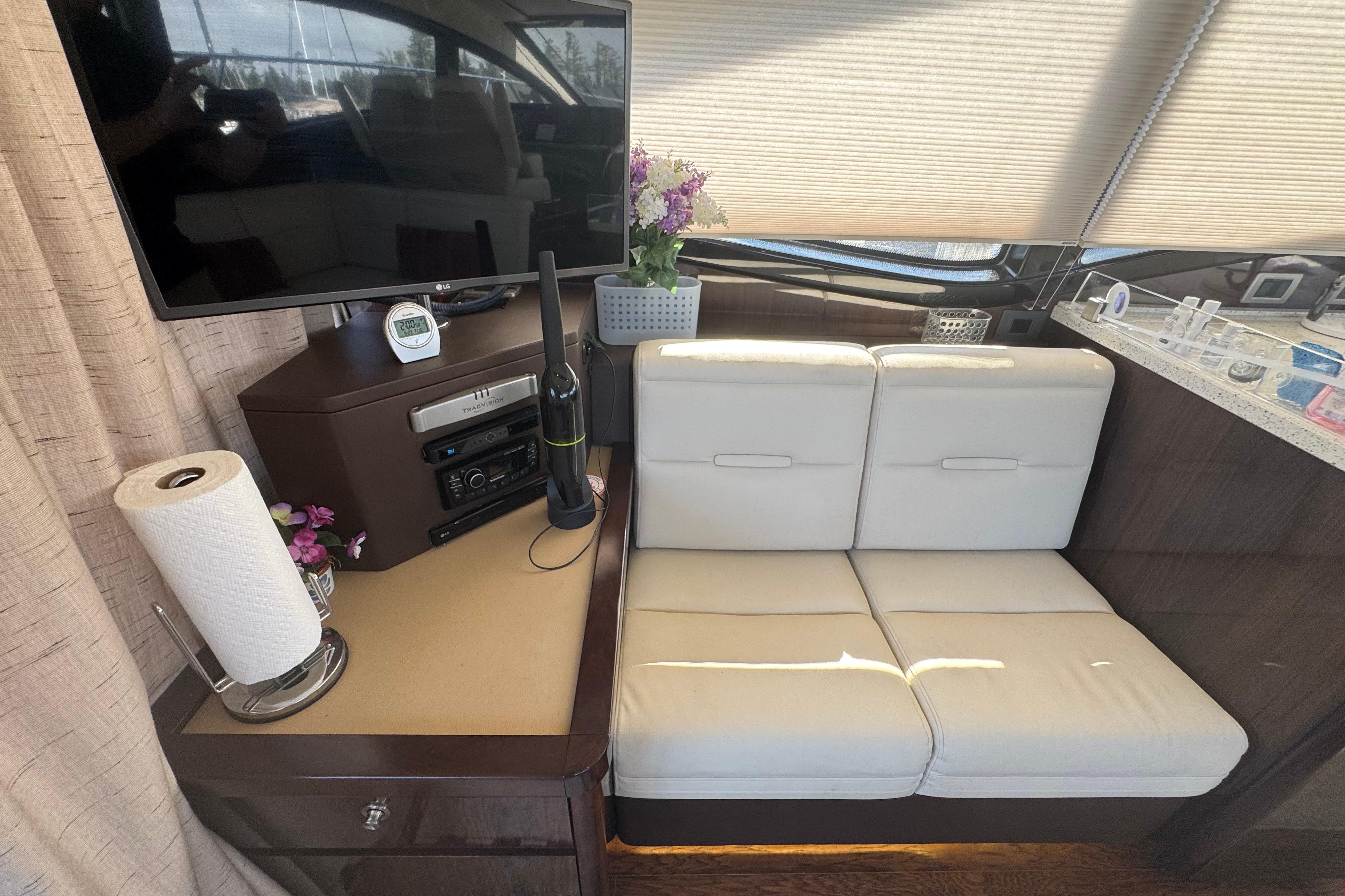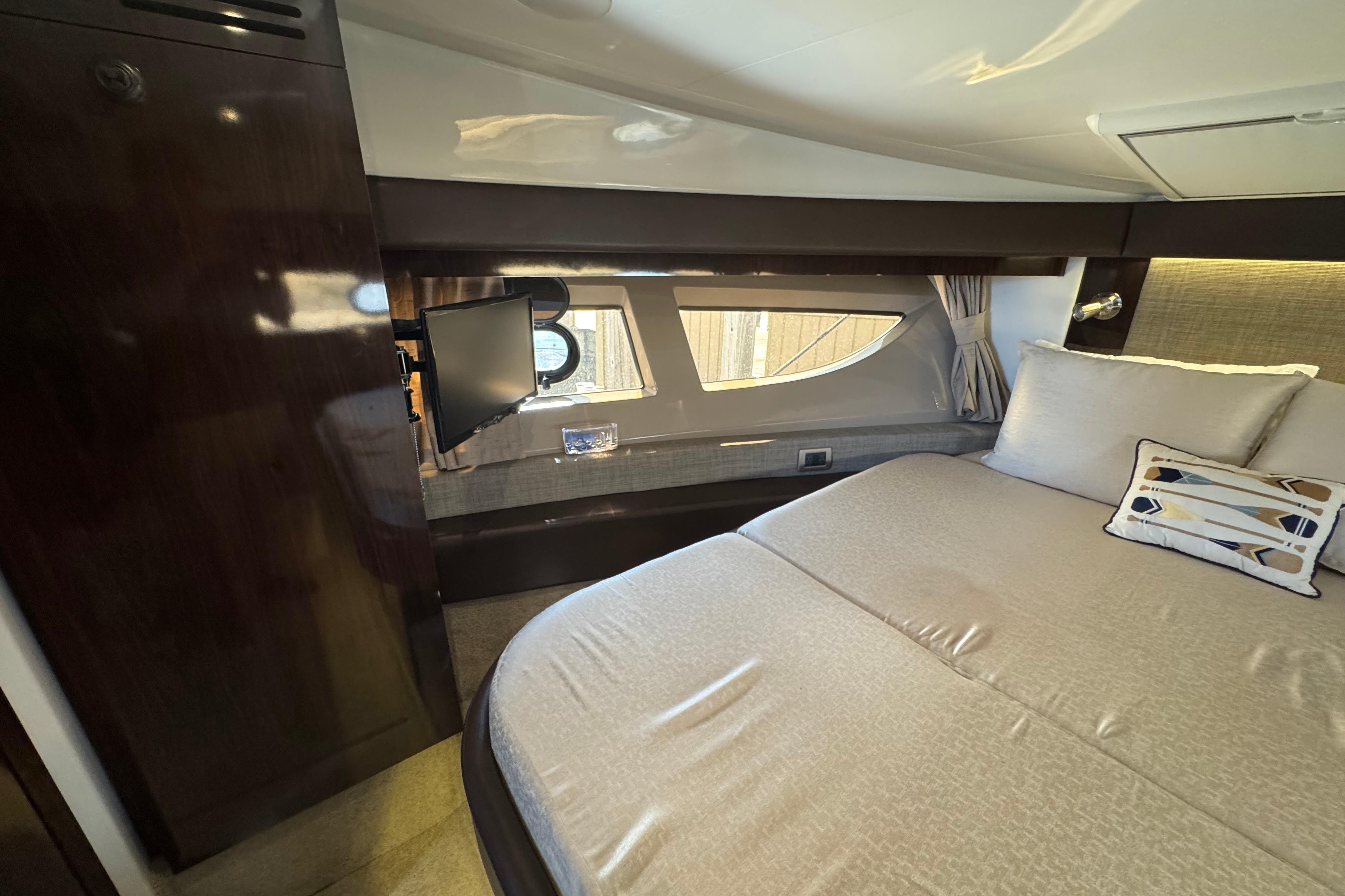 The two-stateroom, one-head layout includes a centerline queen master and full-beam guest cabin. Entertainment upgrades include TVs, TracVision satellite, Rockford Fosgate audio, and more.