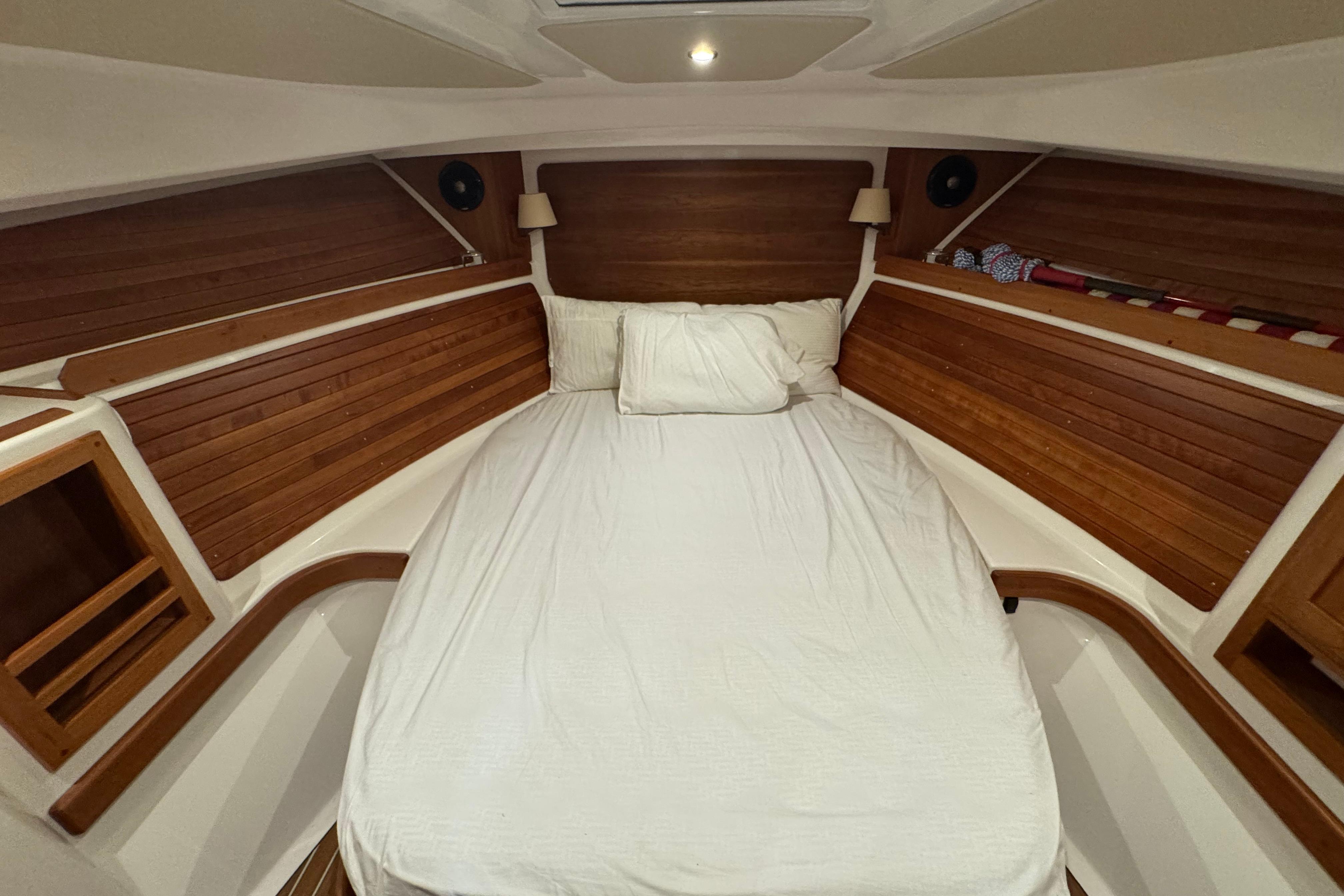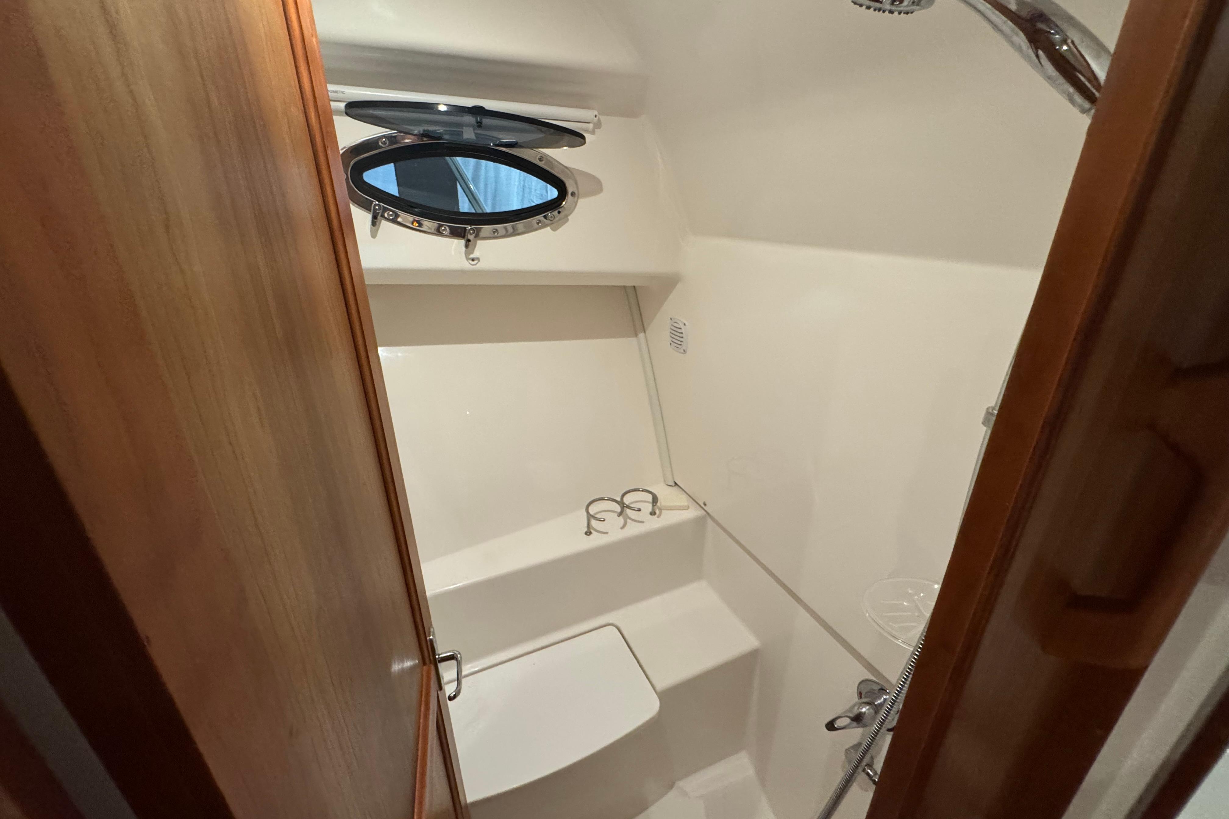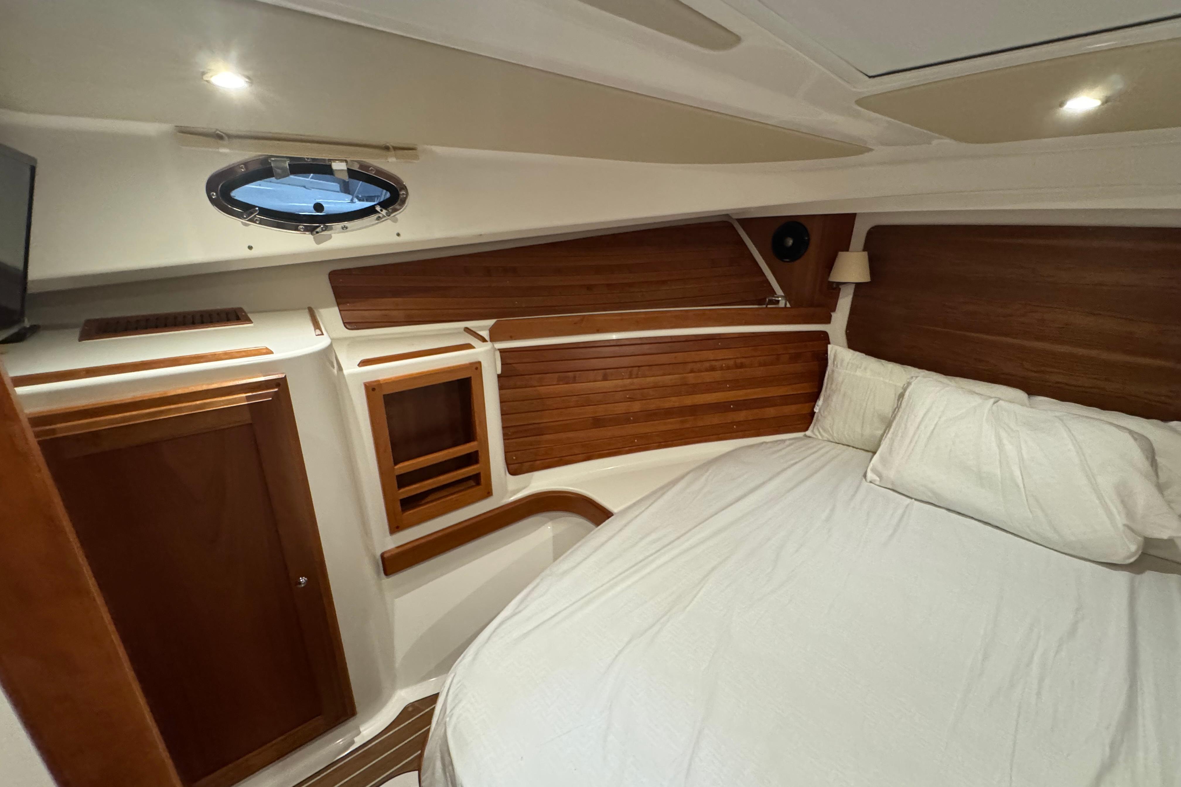 Back Cove Yachts 34O is powered by a pair of Yamaha 300’s, with optional 350 hp Yamaha or Suzuki’s. The hull is fitted with standard bow thruster and designed specifically for outboard propulsion offers cruise and top end speeds approximately 10 knots faster than the traditional single diesel Back Cove. This cockpit is meant for entertaining with an aft facing seat that converts into a helm deck U-shaped dinette or second berth. The standard 5kw diesel generator and cabin A/C below deck coupled with the spacious island berth, separate head and shower remind us that this Back Cove is still intended for cruising.