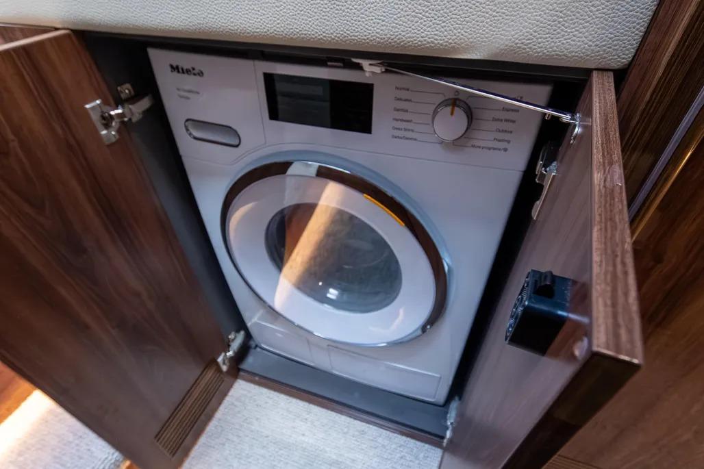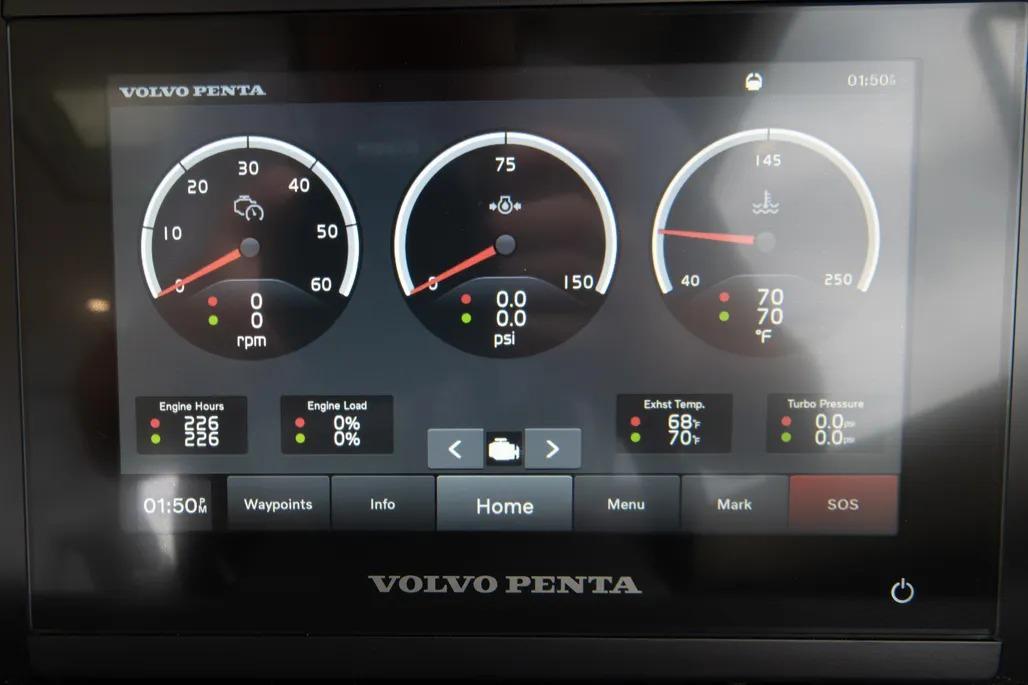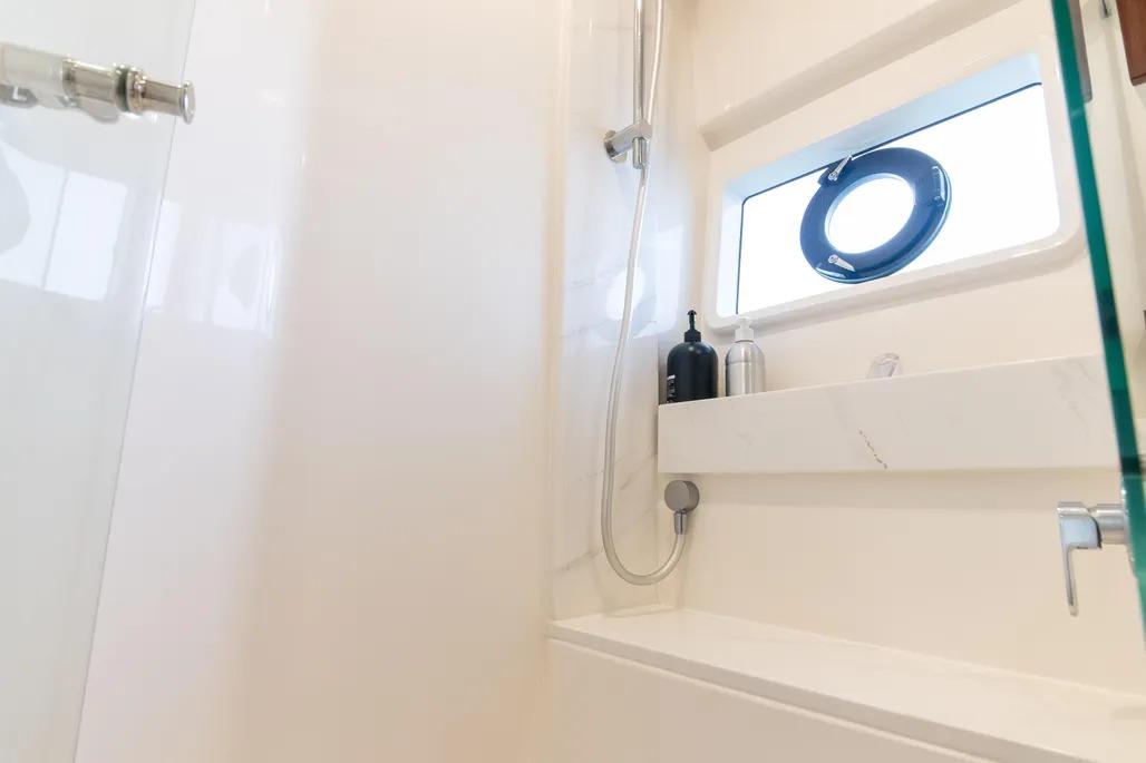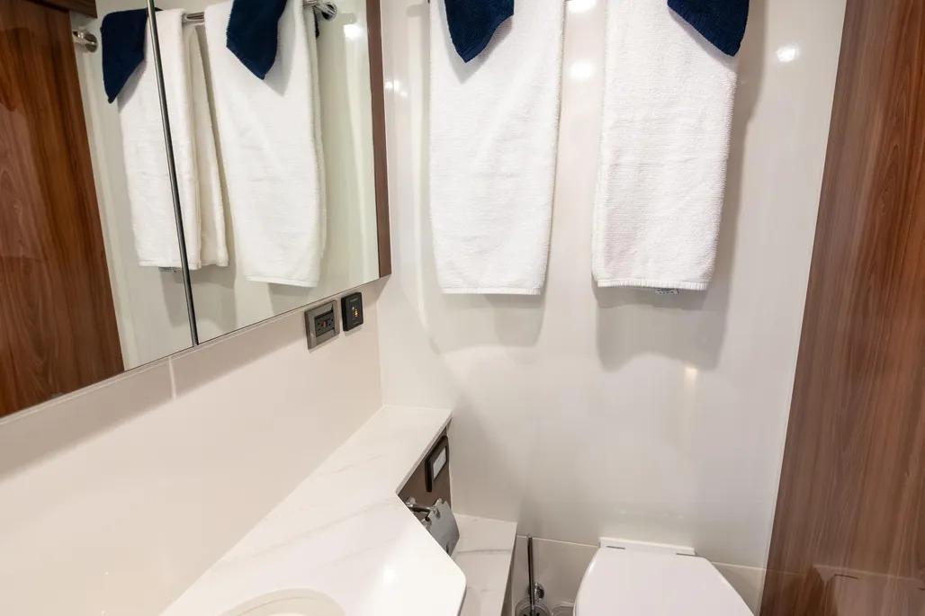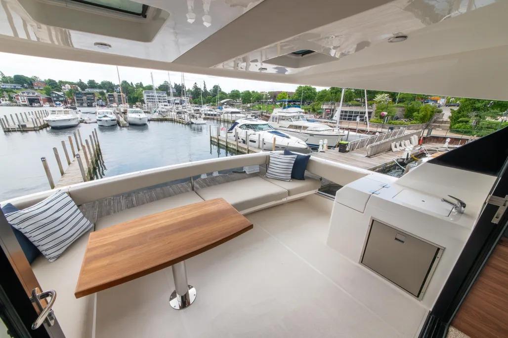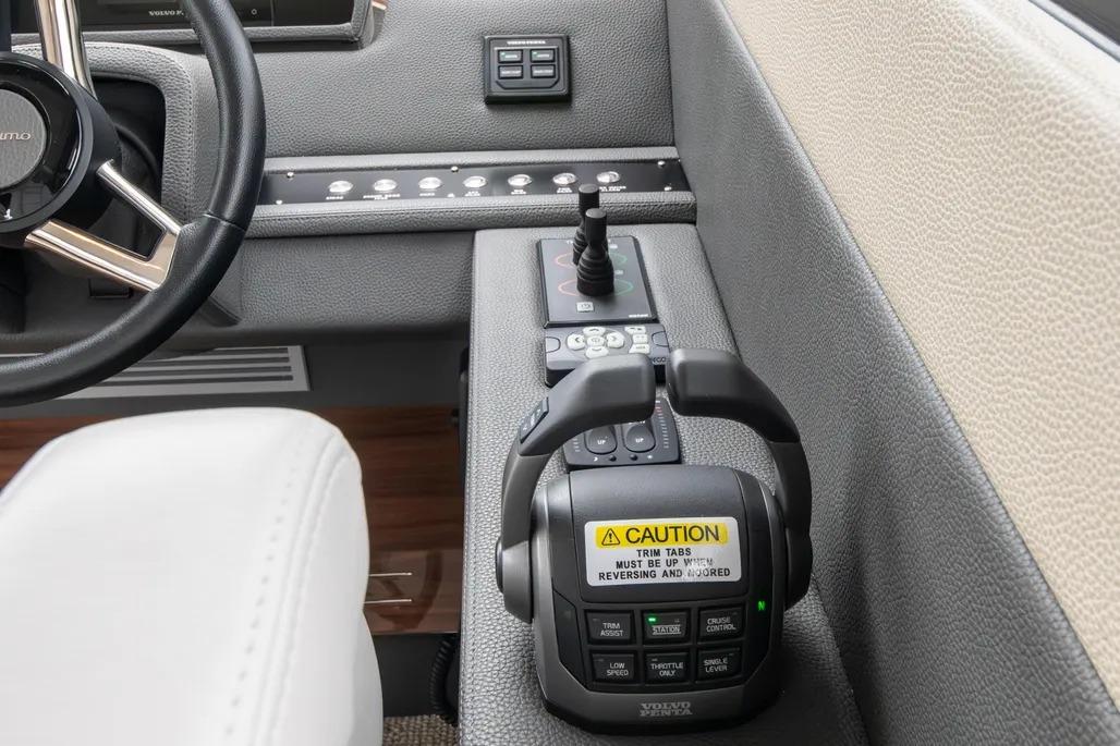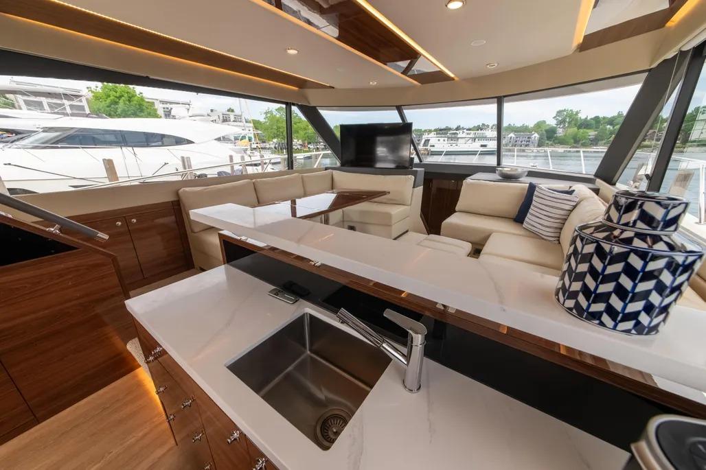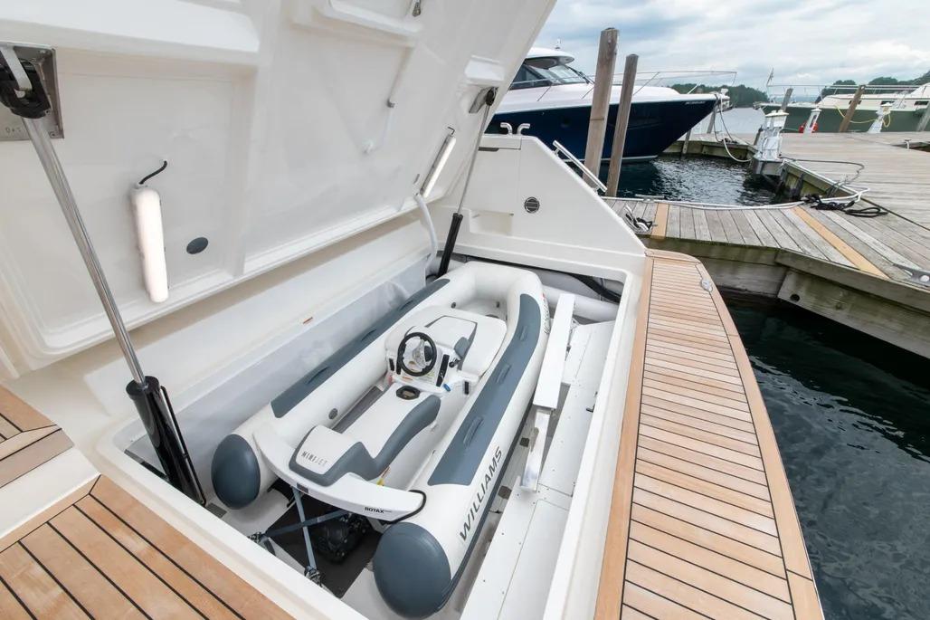 The layout is thoughtful and purposeful, with a galley that feels genuinely capable rather than ornamental – well suited for serious food preparation whether you’re dockside or underway. Tender storage is equally well executed, with a secure davit system that keeps the tender protected in all conditions while remaining easy to deploy upon arrival. Bow and stern thrusters make close-quarters maneuvering effortless, and once underway, the boat’s 1,200-gallon fuel capacity delivers impressive range and confidence-inspiring seakeeping that stands apart in this class.