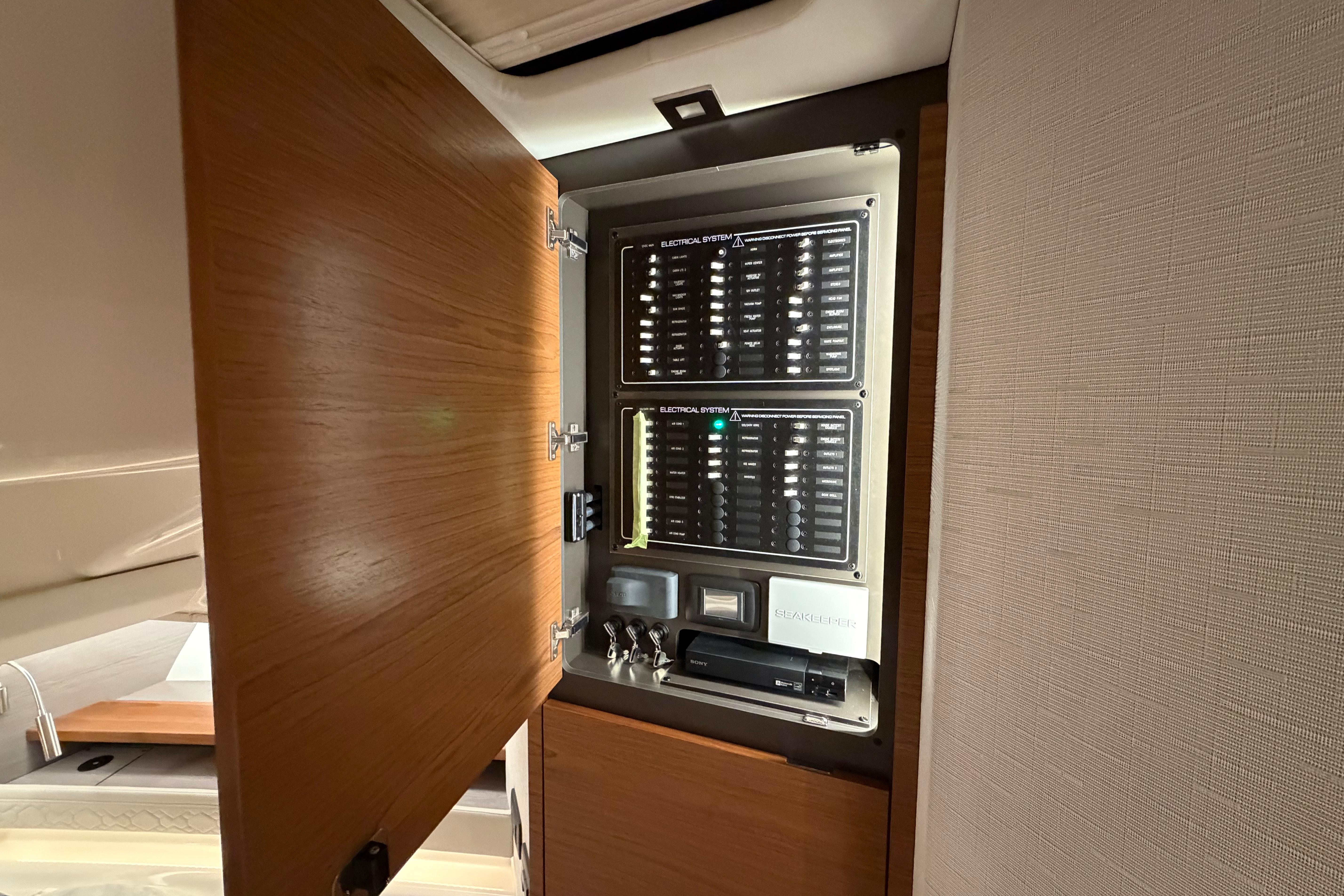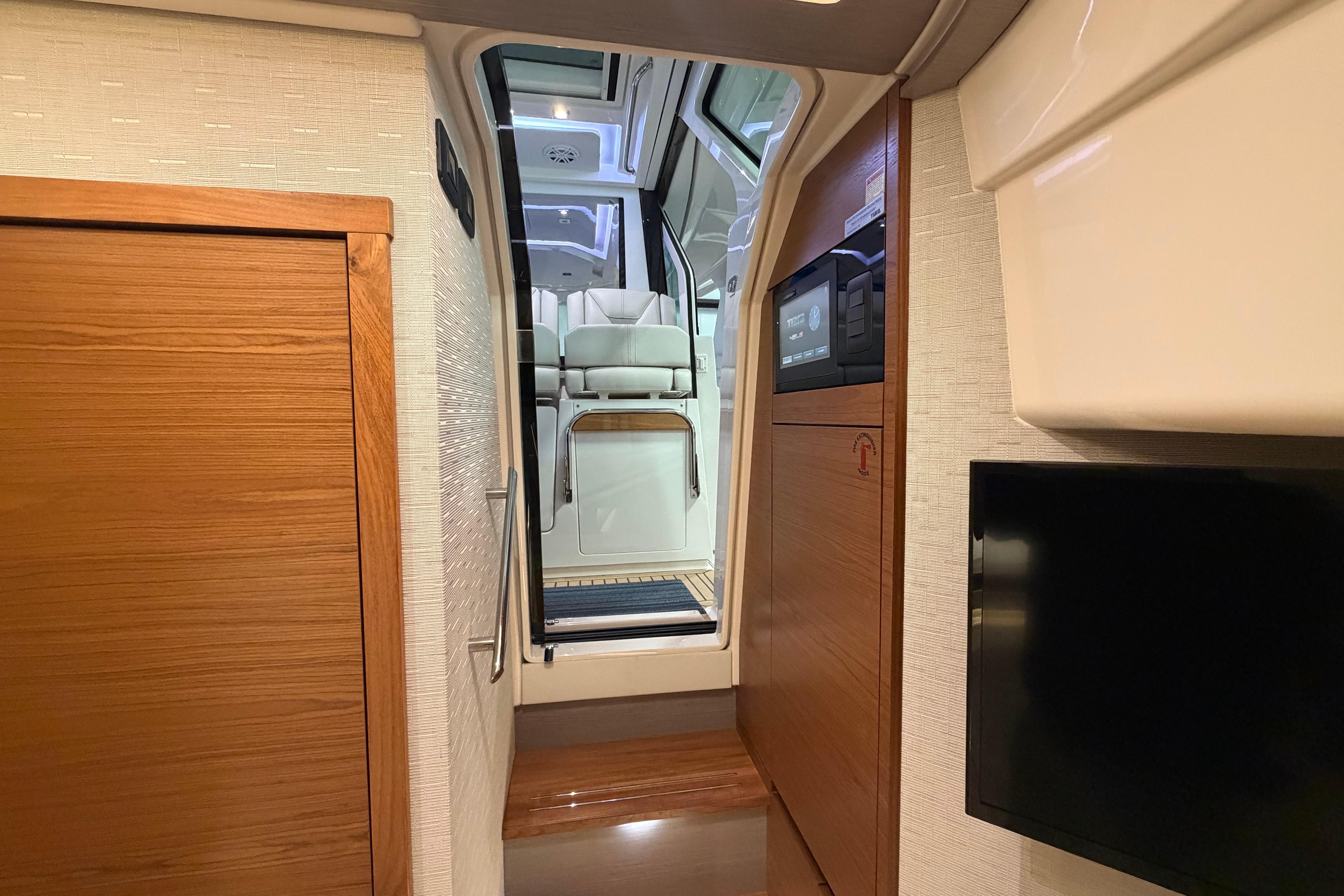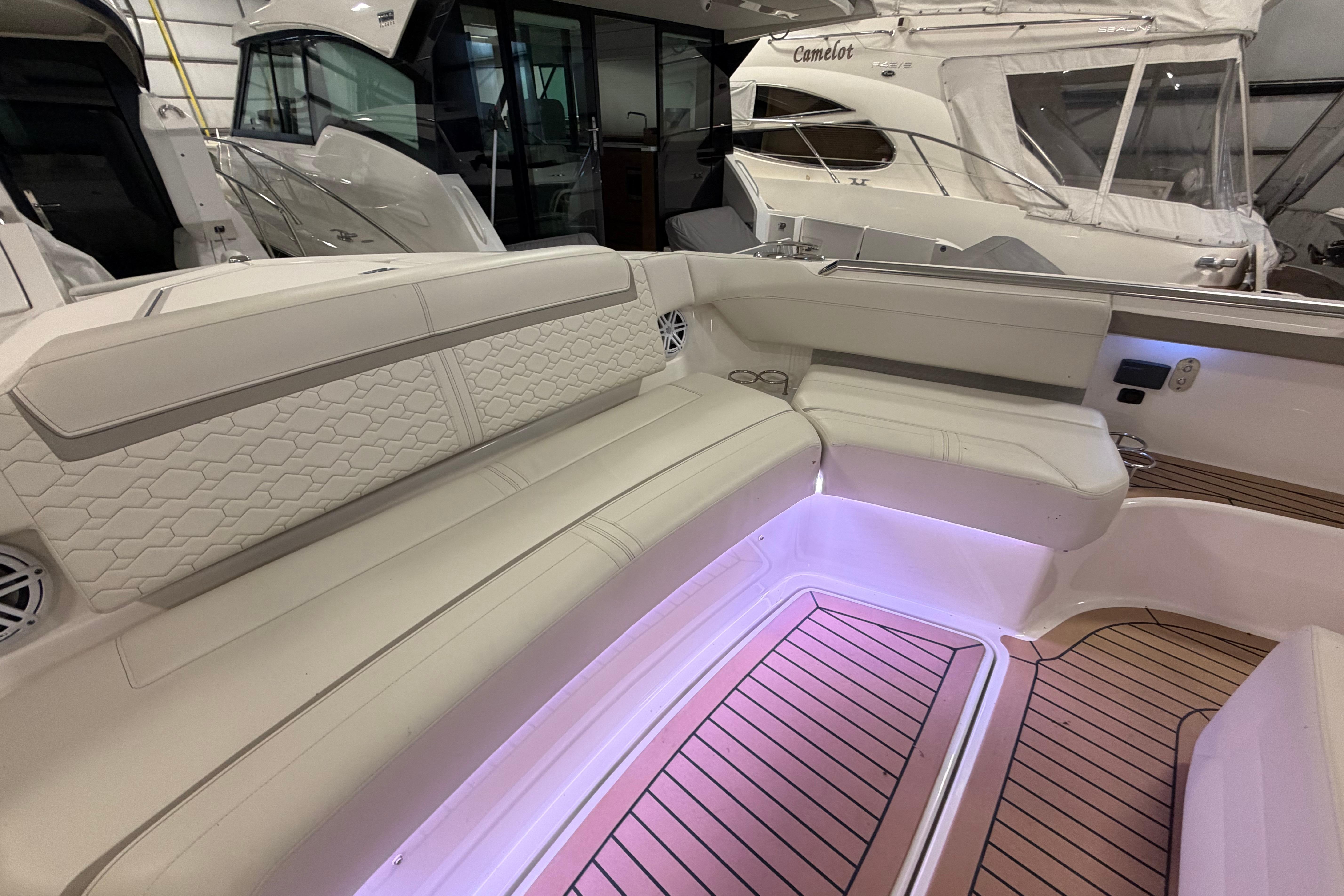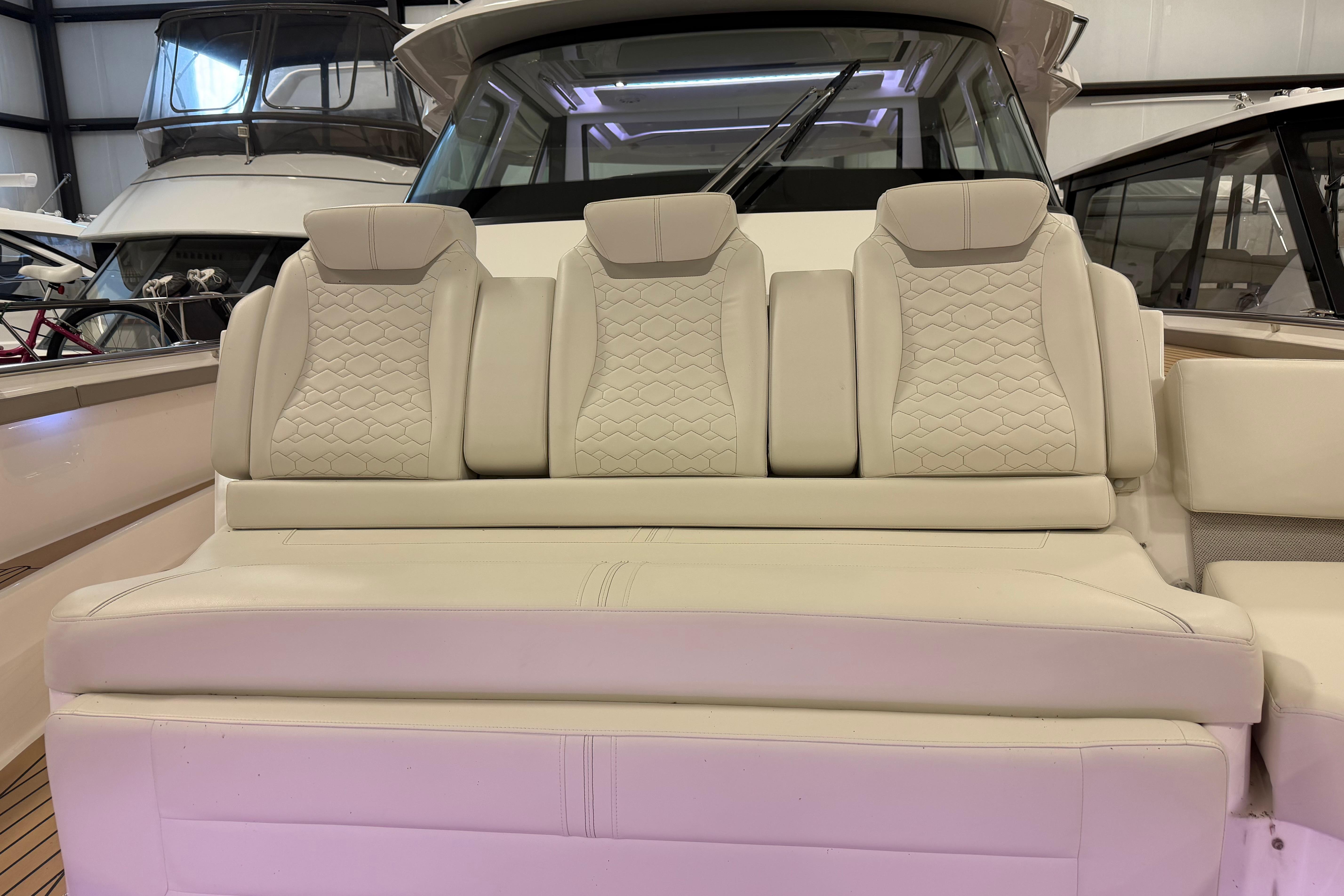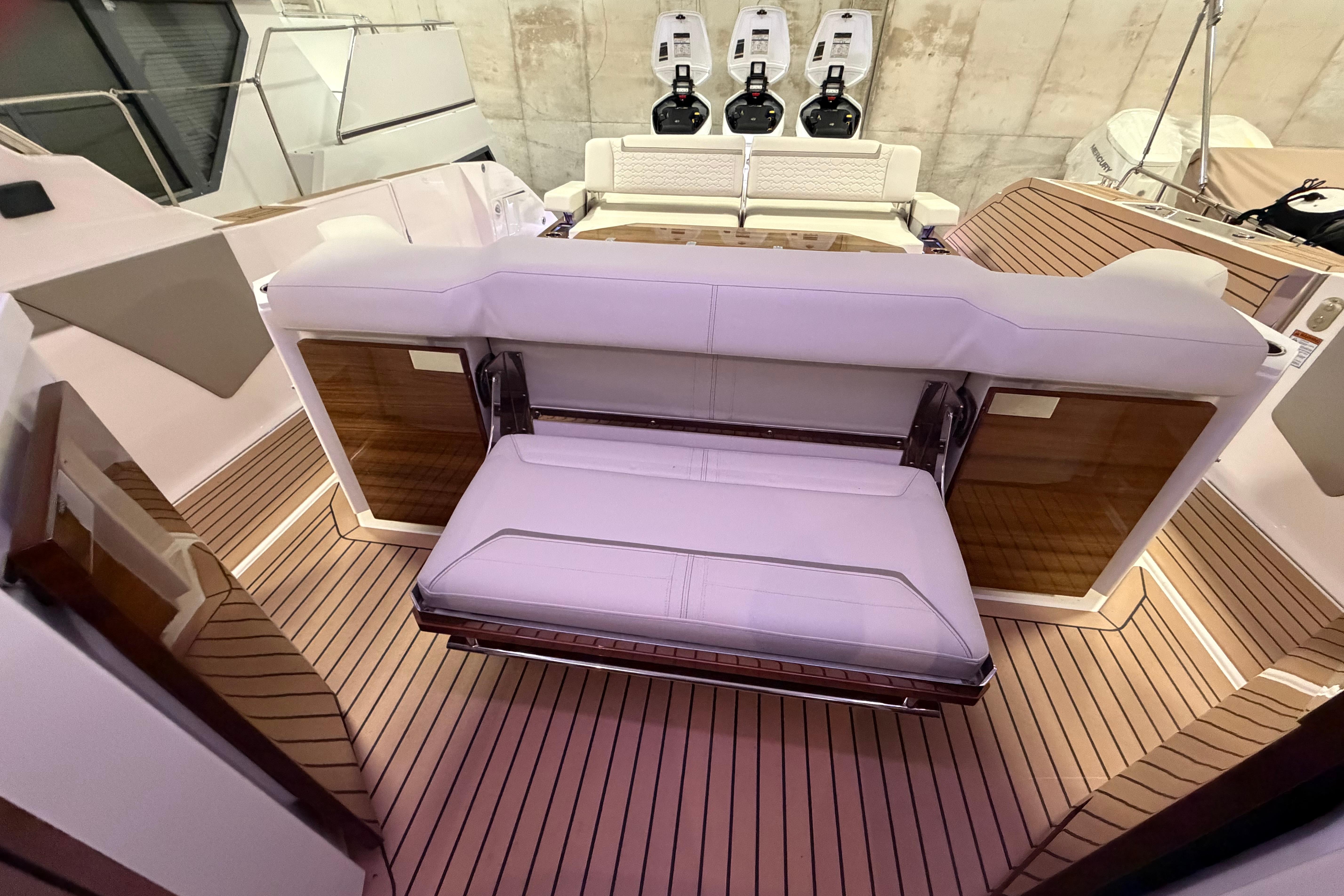 Below deck you’ll find a forward pedestal berth and private head in addition to the aft stateroom that features dual twin berths. The berths may be converted for more comfortable adult sleeping accommodations. Ultraleather and teak blended with a mix of stainless steel, detailed accent stitching and solid surfaces elevate and amplify the elegance of every amenity on board.