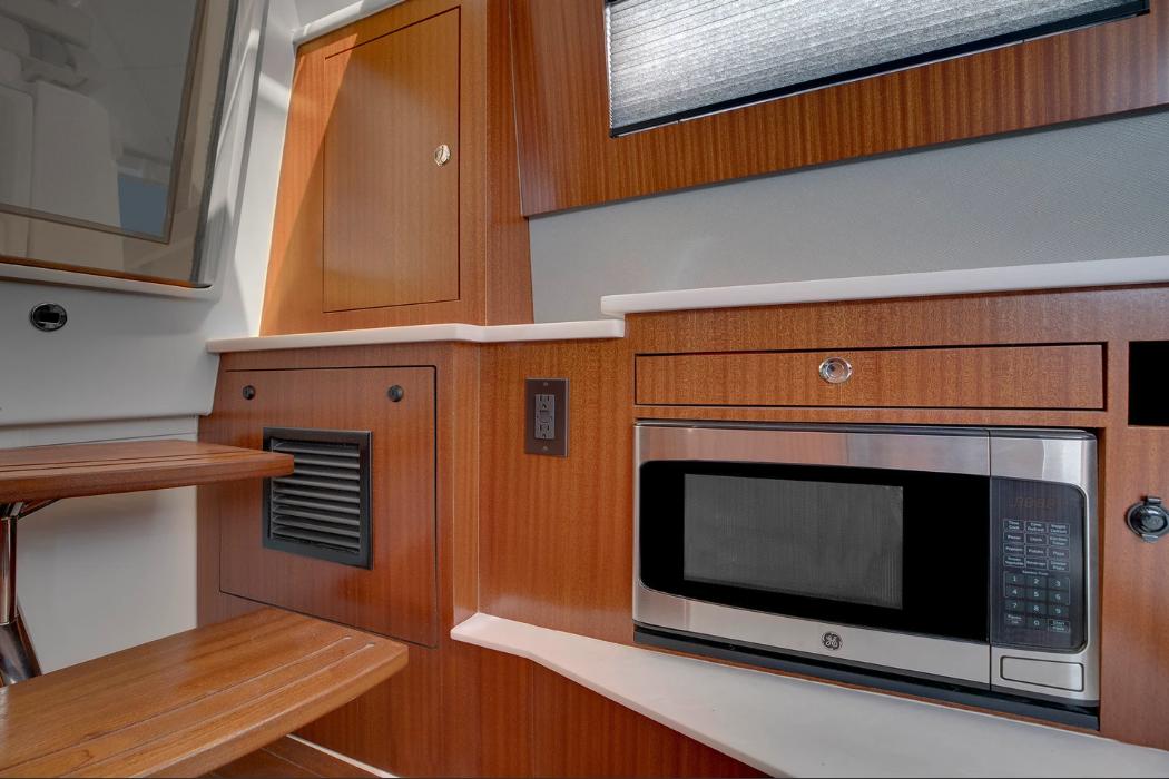 - Molded Cockpit Entertainment Center with Corian Accents, Molded Sink, Hot/Cold Mixing Faucet, Electric Cockpit Grill, Top Load Refrigerator/Freezer (11 gallon) with Digitally Controlled Thermostat, Sliding Storage Tray, Hinged Fiberglass Lids, Cutting Board, Dedicated Storage Drawers and 120V Outlet with GFI Protection
