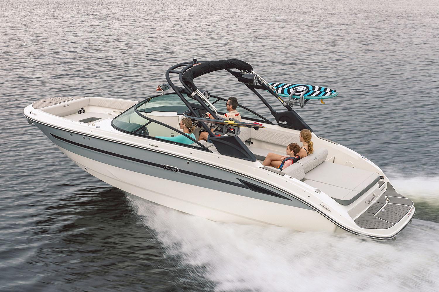 Built-in board storage and our intuitive surf system pairs ride-ready features with next-gen Sea Ray design language. Propelled by a standard 350hp MerCruiser® 6.2L engine with a forward-facing Bravo Four S® drive, contra-rotating props, SmartCraft Technology and DTS, the boat is enabled for family-friendly water sports and improved maneuverability when docking or traveling at low speeds. A reclining cockpit backrest expands the aft sunpad and gives room to spread out and soak in the sun. Helm and portside seat backrests convert to give full versatility tothe cockpit layout. The ample starboard interior storage space under the helm can be upgraded to add a head, further extending your day on the water.