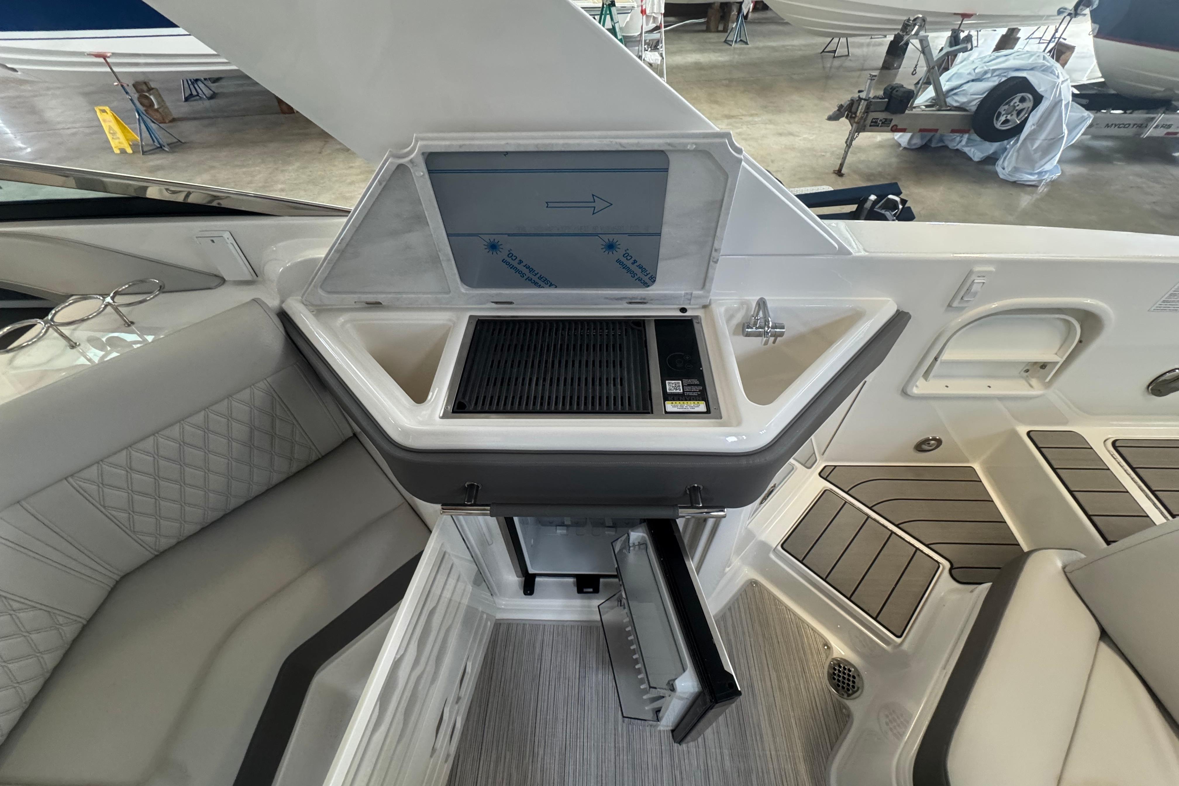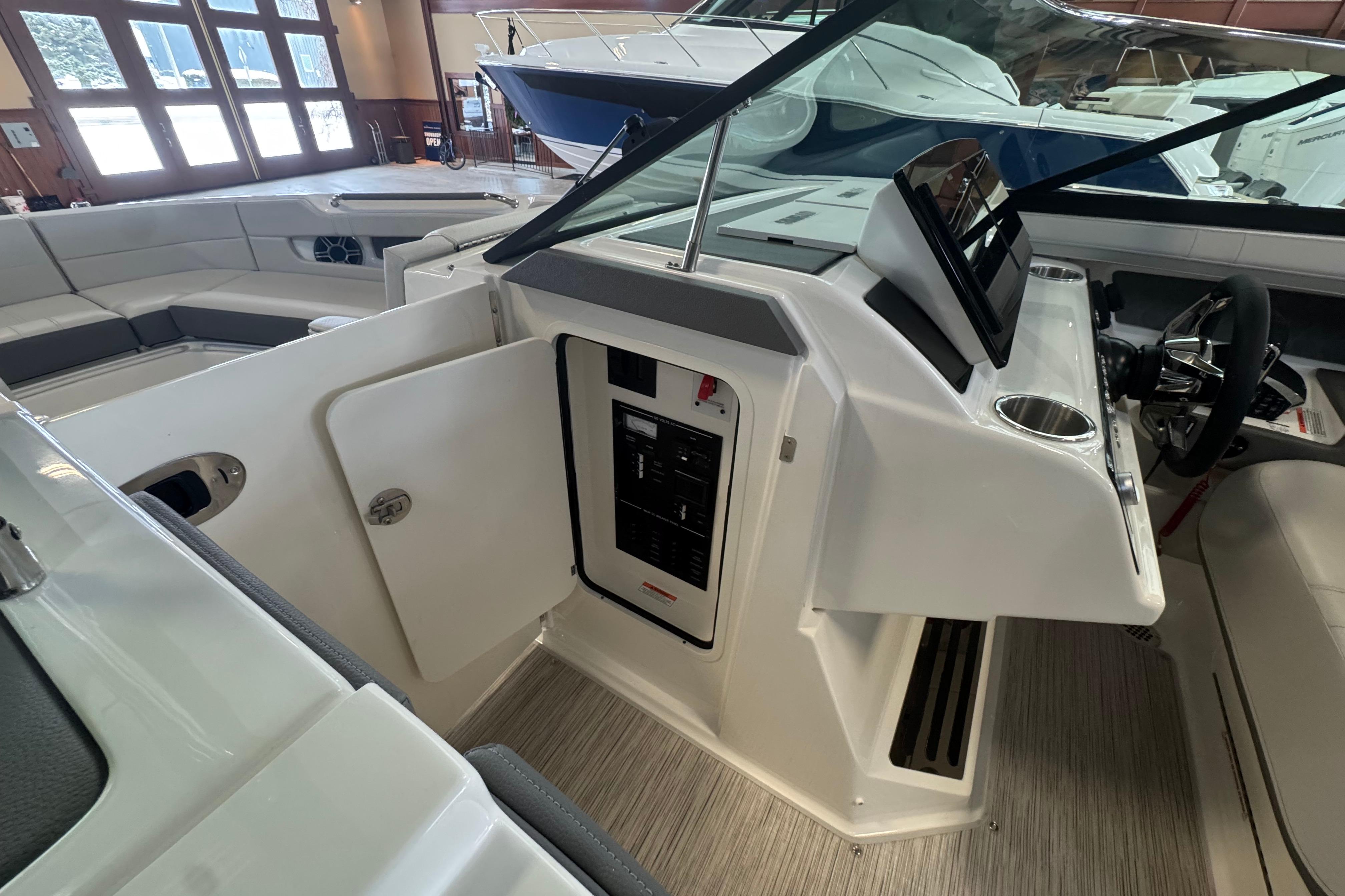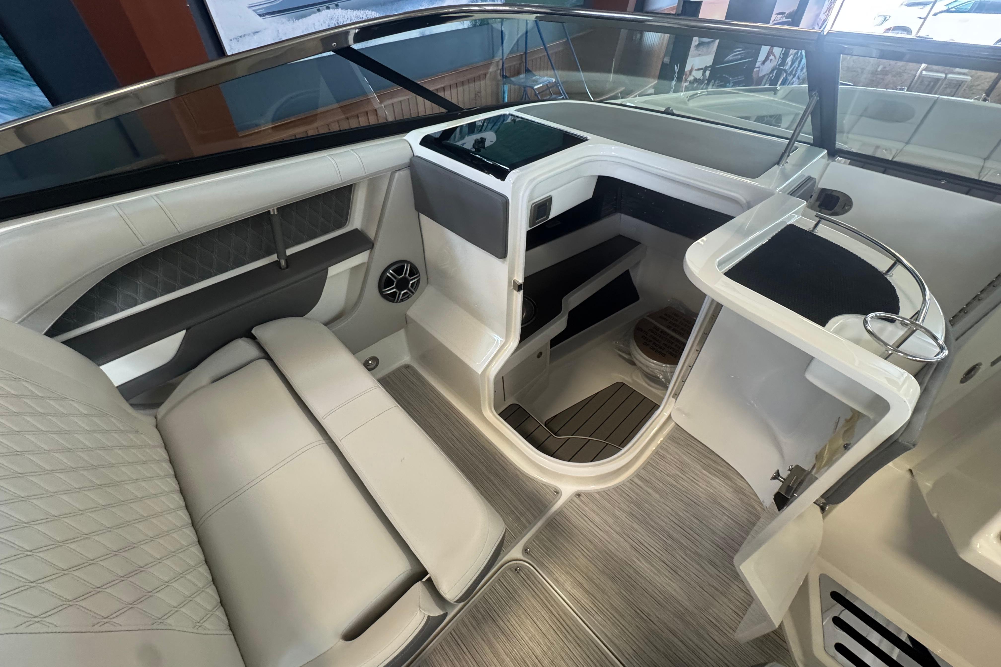 - Interior Storage Compartment (Under Helm): Access From Flip Up Bow Aft Cushion/ Bolster; Light; Access Door To Backside of Dash Instruments; Carpeted Floor